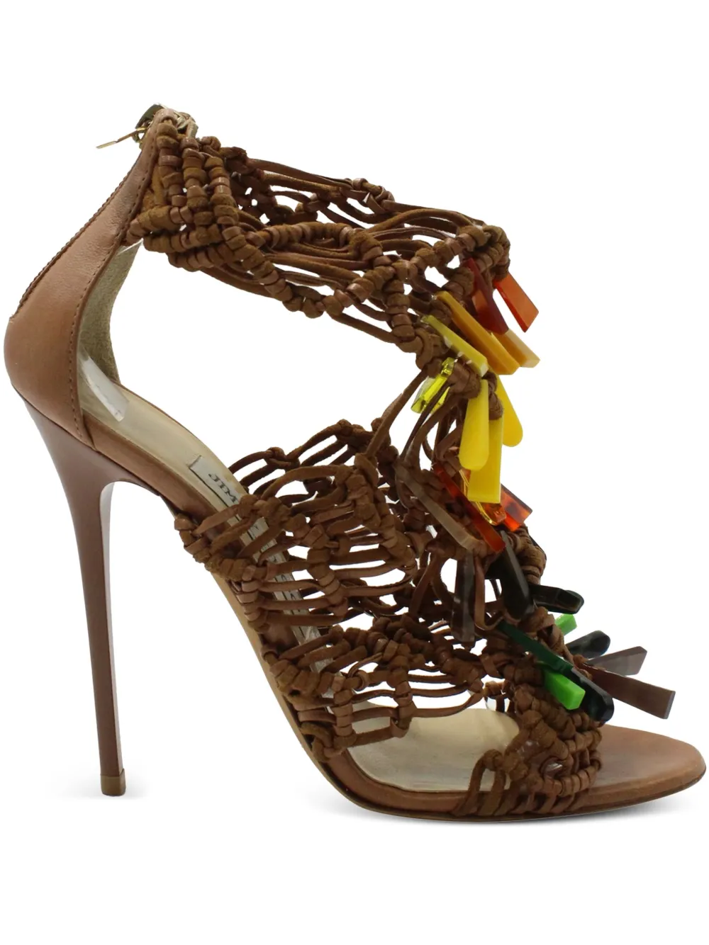 brown leather macramé detailing open toe bead embellishment rear zip fastening Condition: EXCELLENT. This previously owned item is in near-perfect condition with no signs of damage or use.
