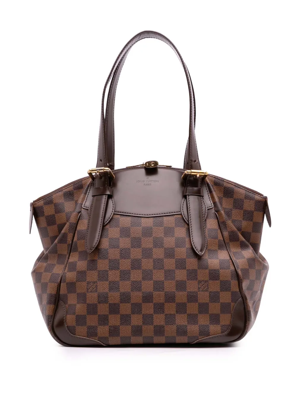 damier canvas body with leather trim flat leather straps 2 way top zip closure interior slip pockets. The exterior corners were repainted brown Serial Number: VI0171 Inclusions: padlock. Condition: FAIR. This previously owned and used item is in fair condition with visible signs of use. This may include fading of material or plating, loose stitches, discolouration, patina or heavy scratches. Please refer to the photos on this product page for a detailed view of the item, including any damages declared.