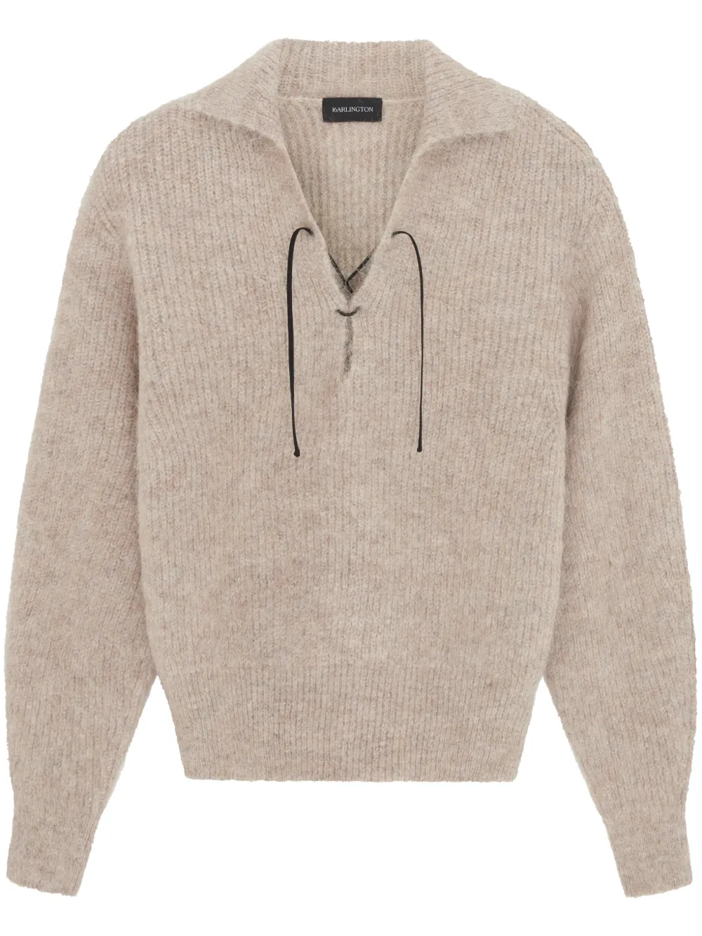 Taupe, misto lana d'alpaca, design lavorato a maglia, colletto alla francese, scollo a V, chiusura frontale con fiocco, maniche con spalle scese e maniche lunghe.