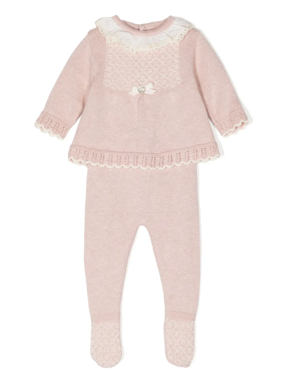 Rosa pastello, misto cotone e cashmere, maglia chunky, colletto in pizzo, chiusura posteriore con bottone, maniche lunghe, orli con ruches, orlo increspato e scarpine.