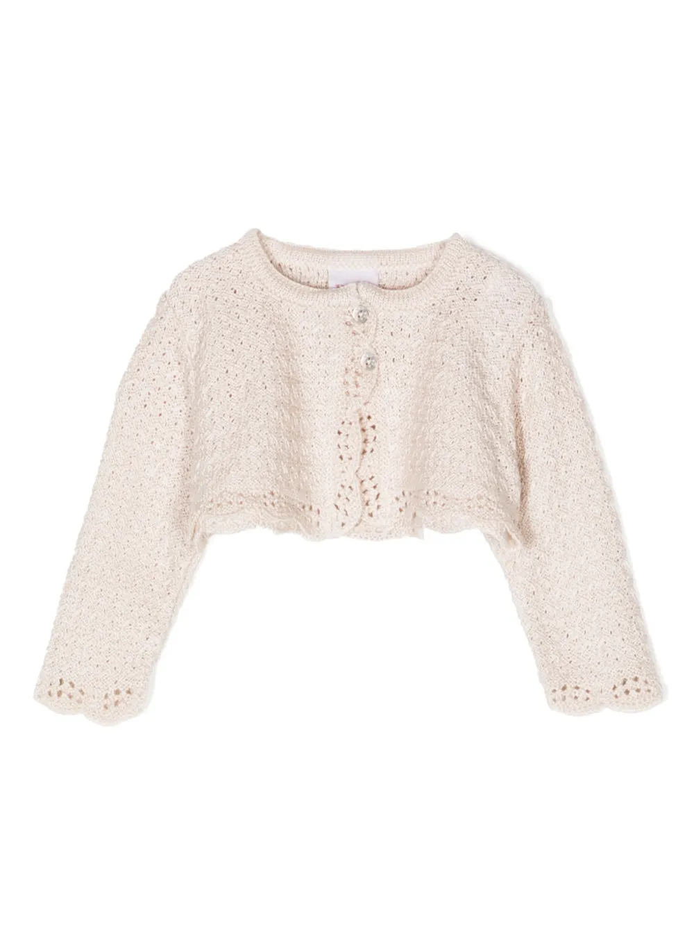 round-neck cropped cotton cardigan from Paz Rodriguez featuring ivory white, knitted construction, round neck, front button fastening, long sleeves, scallop hem, cropped and cotton.
