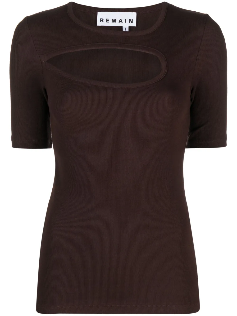 fine-ribbed cut-out T-shirt from REMAIN featuring stretch organic cotton, cut-out detailing, crew neck, chocolate brown, fine ribbed, short sleeves and straight hem.