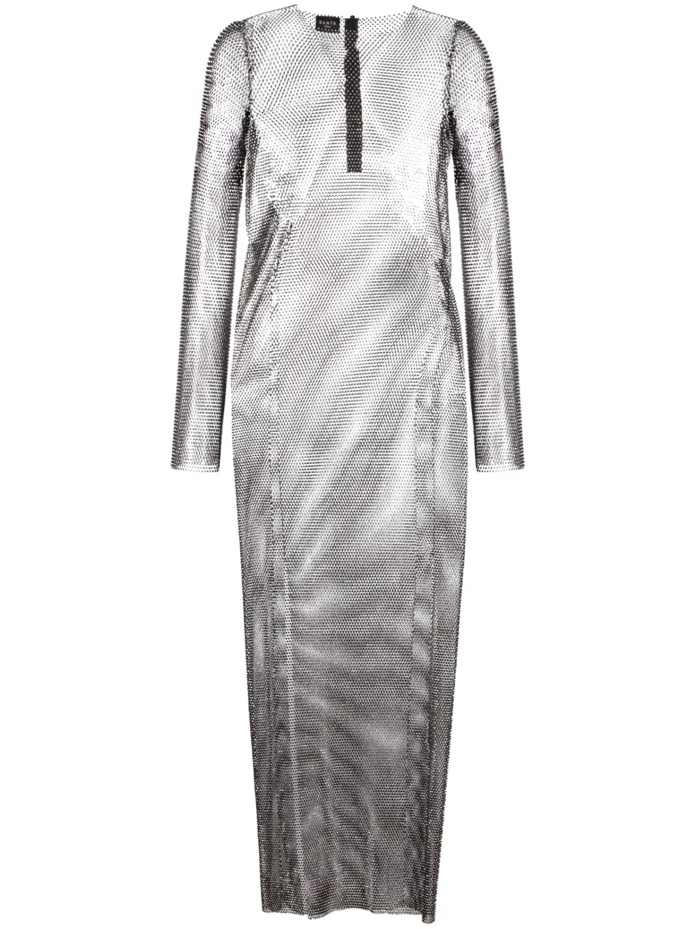Nero, decorazione con diamanti sintetici, effetto semi trasparente, due spacchi laterali alla coscia, chiusura posteriore con zip, girocollo, maniche lunghe, orlo dritto e design lungo.