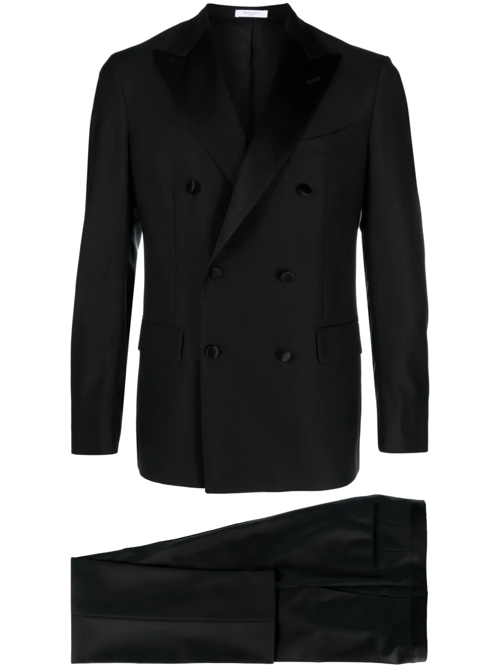 double-breasted virgin wool blend suit from BOGLIOLI featuring jet black, virgin wool blend, stretch-design, tailored cut, peak lapels, double-breasted button fastening, long sleeves, buttoned cuffs, chest welt pocket, two front flap pockets, English rear vents, straight hem, belt loops, pressed crease, off-centre front fastening, two side slash pockets, two rear jetted pockets and straight leg.