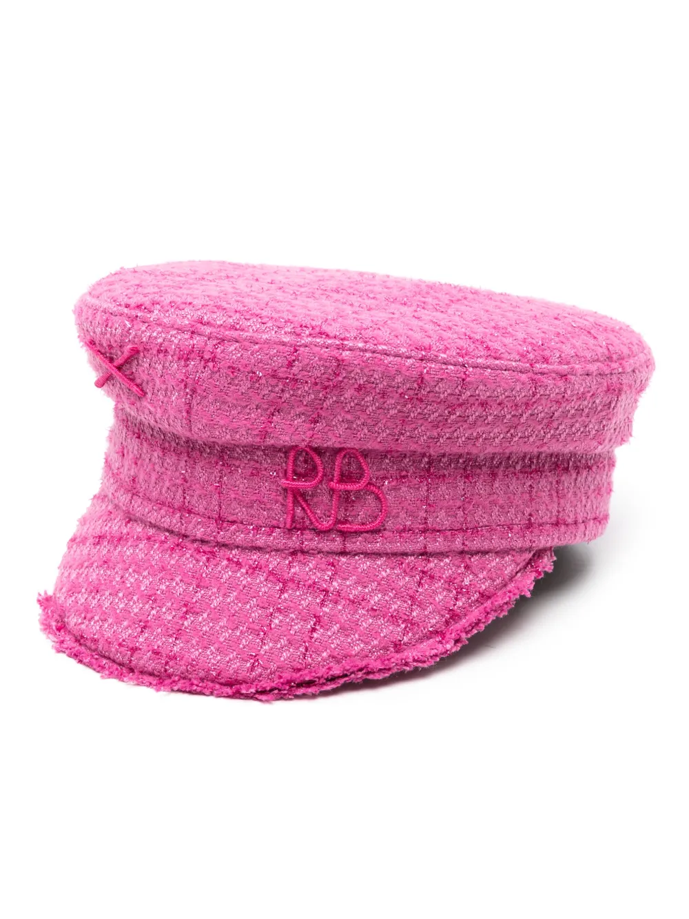 Baker Boy tweed cap from RUSLAN BAGINSKIY featuring bubblegum pink, tweed, appliqué logo, curved peak, cotton lining and pull-on style.