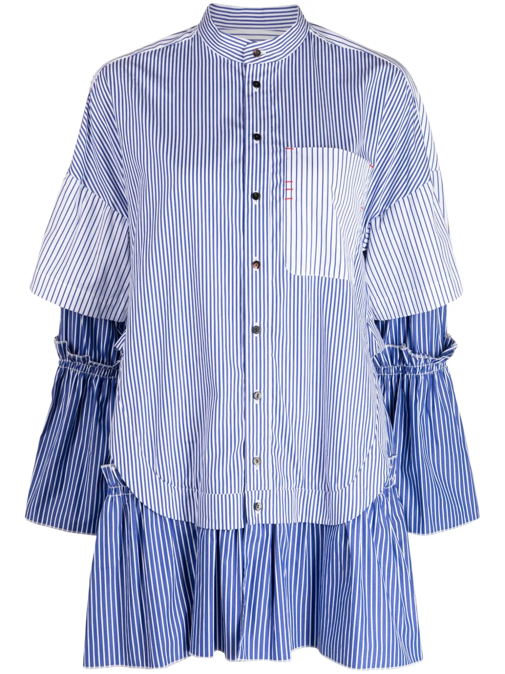 striped layered shirt from ENFÖLD featuring blue, cotton, layered design, multi-way stripe pattern, ruffled detailing, band collar, front button fastening, drop shoulder, long sleeves, flared cuffs and flared hem.