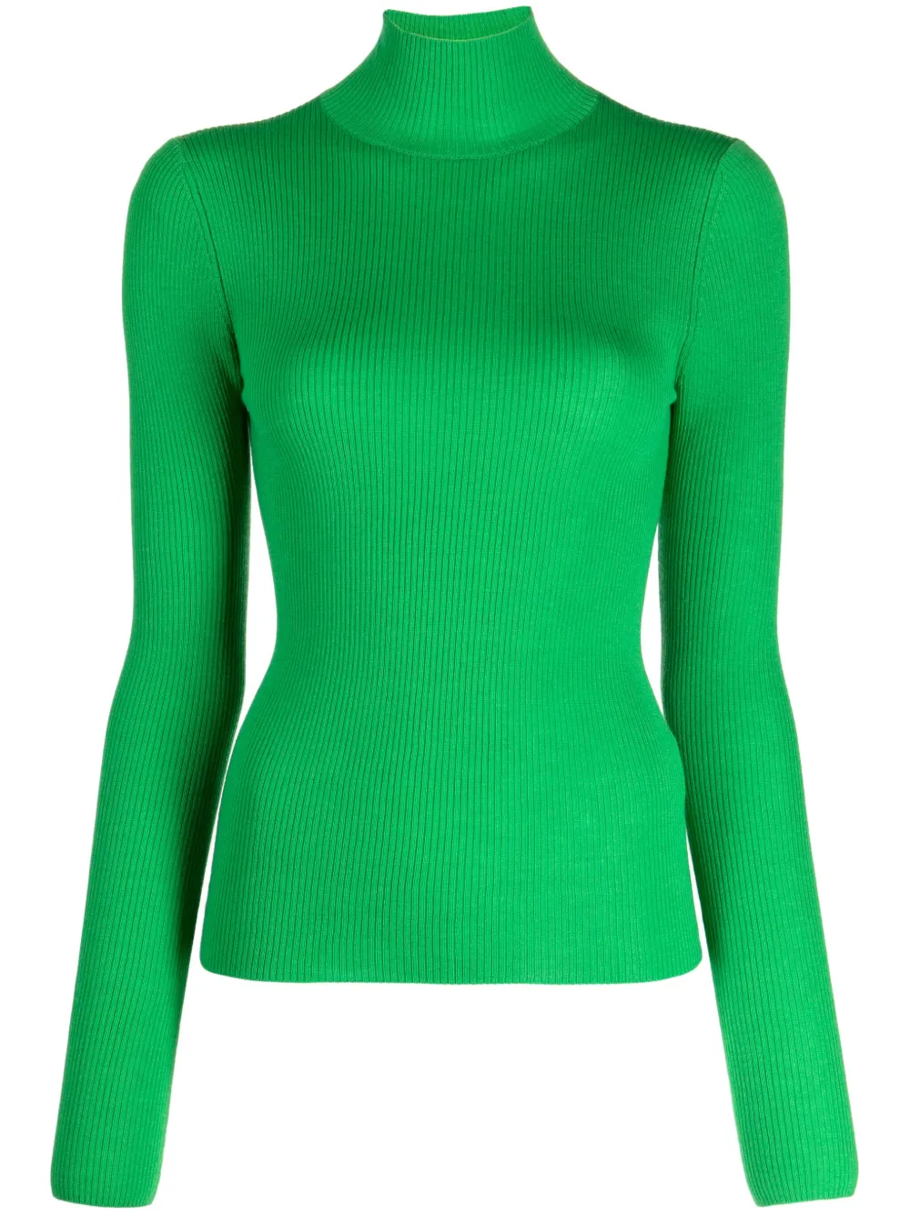 high-neck ribbed wool jumper from ENFÖLD featuring bright green, wool, ribbed knit, high neck, long sleeves and straight hem.