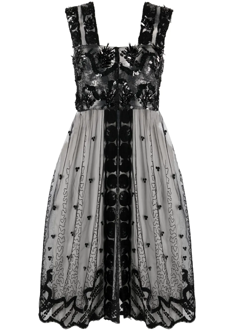 paillette-embellished semi-sheer long top from 16ARLINGTON featuring jet black, semi-sheer construction, paillette embellishment, all-over motif embroidery, ruched detailing, square neck, concealed front fastening, sleeveless, scallop hem and mid-length.