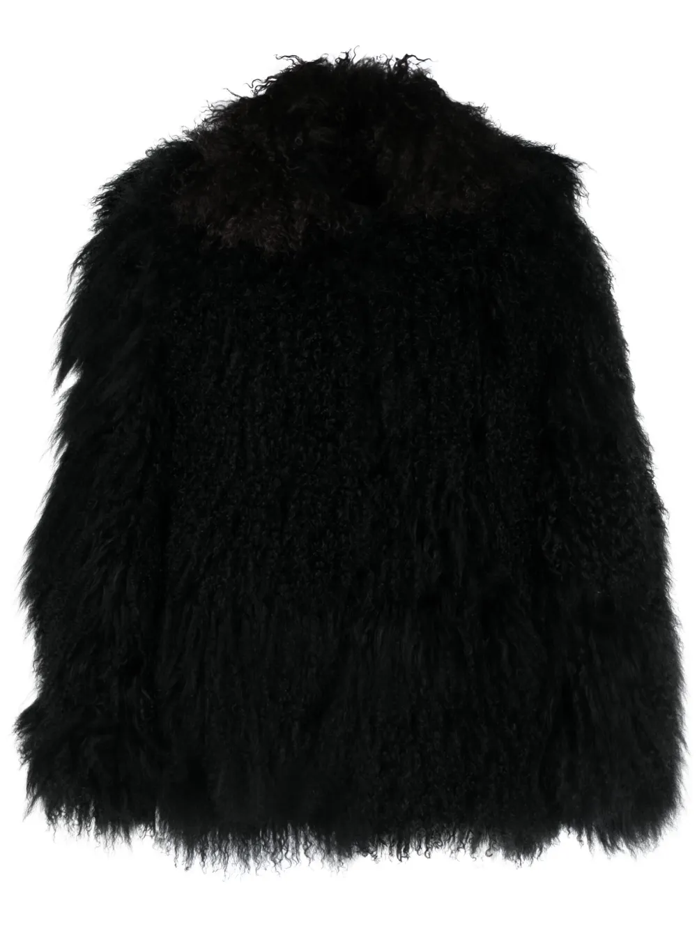 Nero, marrone cedro, pelle di pecora, shearling, collo alto, colletto shearling, chiusura frontale nascosta, maniche lunghe e lunghezza sopra il ginocchio.