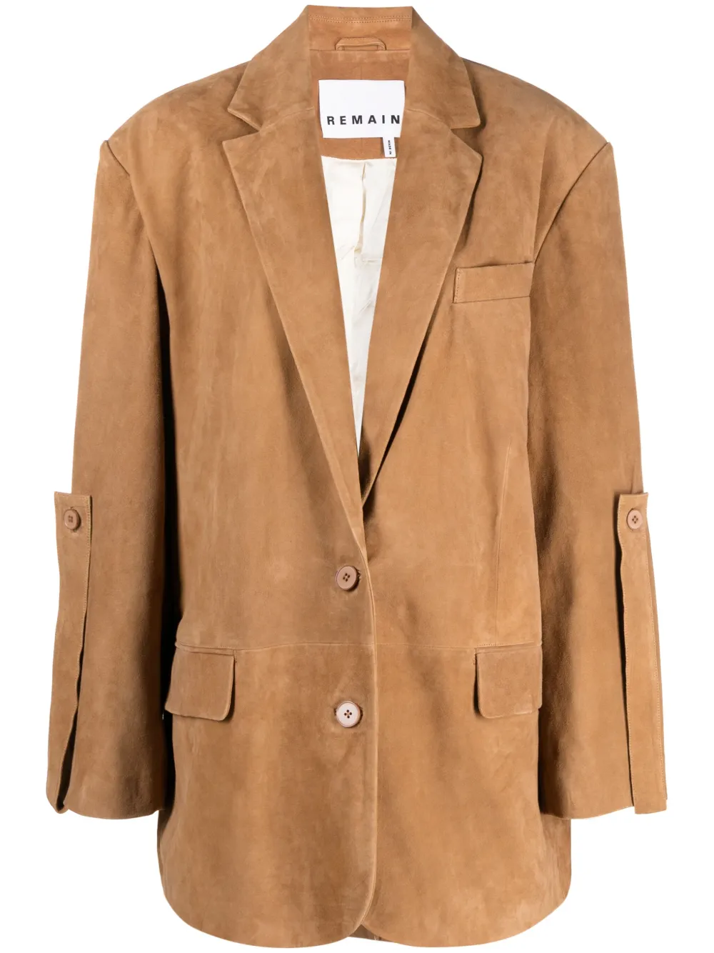 leather single-breasted blazer from REMAIN featuring tobacco brown, notched lapels, front button fastening, drop shoulder, chest welt pocket, two front flap pockets, long sleeves, buttoned cuffs, central rear vent and curved hem.