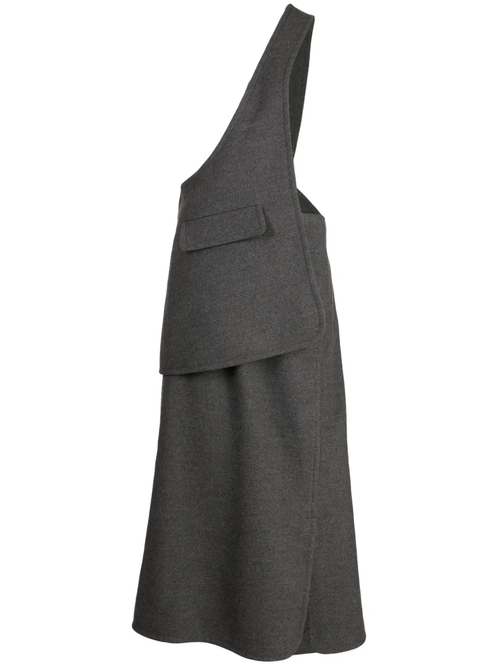Grigio antracite, design asimmetrico, design a portafoglio, design monospalla, design con fascia singola, tasca frontale con patta e lunghezza media.
