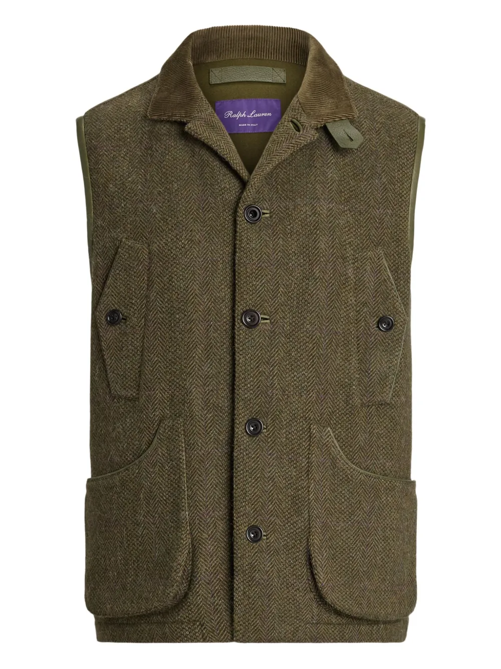 Olivgrün Fischgrätenmuster Knopfverschluss eingefasste Taschen ärmellos