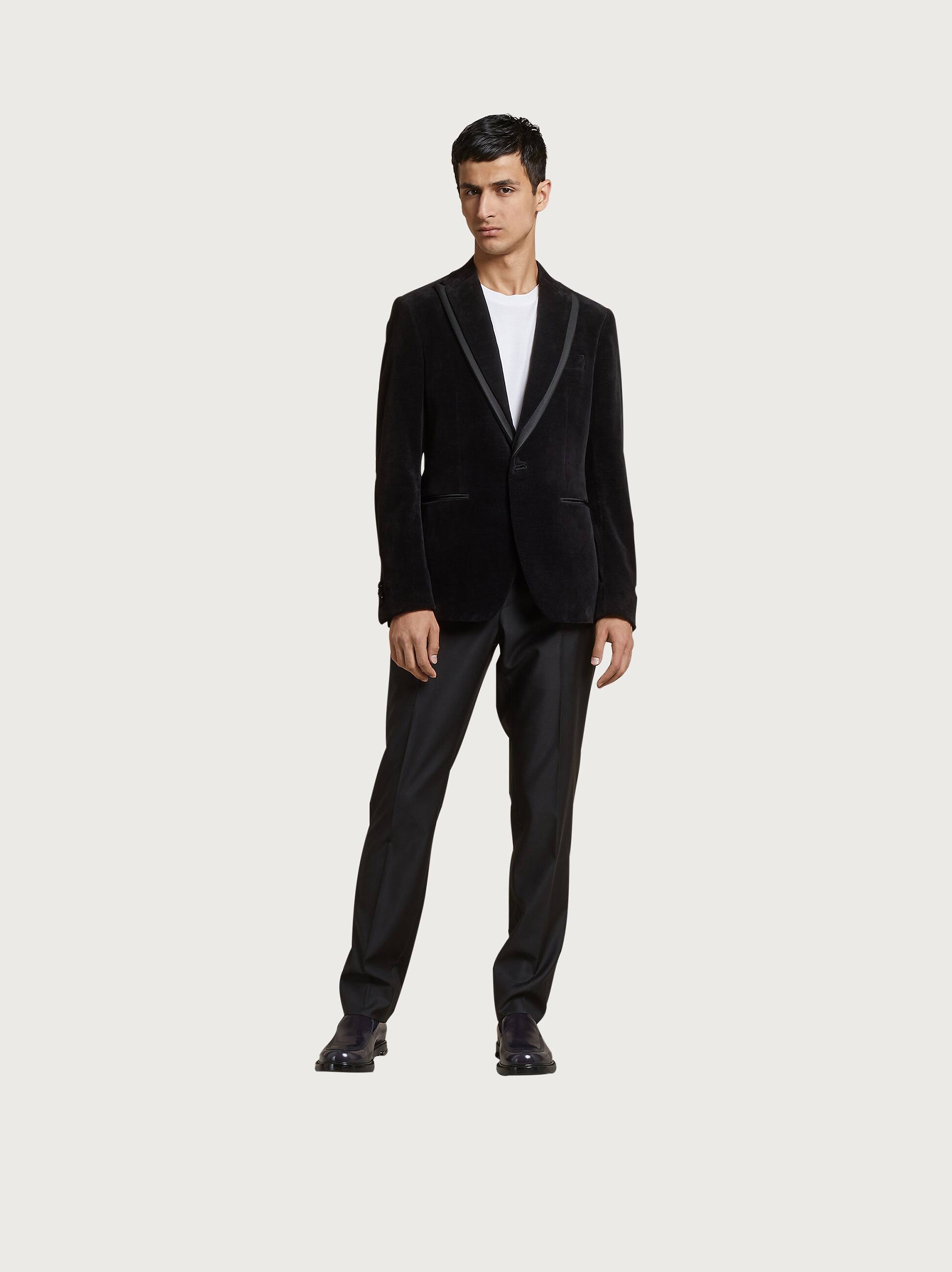 Evening dress per eccellenza, lo smoking in velluto è un grande classico per l'uomo formale. La struttura mono petto viene arricchita da bordature in satin sui rever, sulle tasche e sulla cintura dei pantaloni. Tocco di classe, le cuciture interne in tonalità rosso Ferragamo. Da completare con camicia francese con gemelli, panciotto e cravattino per un black tie impeccabile.Collezione PE 20 in 100% cotone